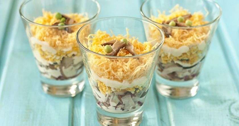 - Переложи салат в красивую мисочку и укрась грибочками. Также можешь украсить тертым сыром или веточками петрушки — подача зависит только от твоих эстетических и вкусовых предпочтений.