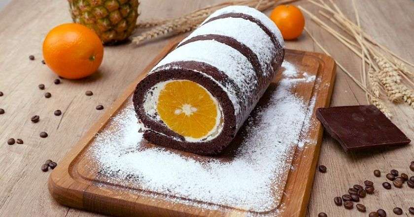 - Готовый рулет присыпь сахарной пудрой, укрась дольками мандаринов, разрежь на порционные ломтики и скорее подавай к столу. Приятного аппетита!
