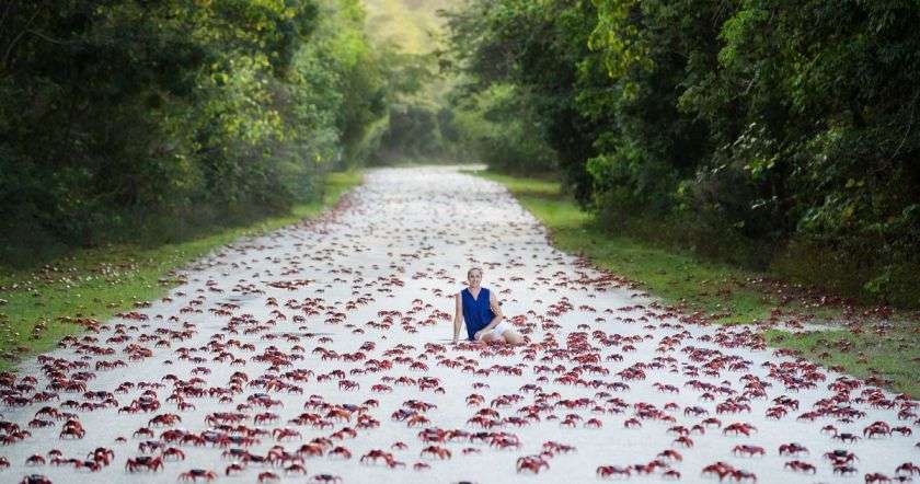 40-летняя Кирсти Фолкнер стала свидетелем ежегодной миграции красных крабов на острове Рождества. Массовая миграция примерно 45 миллионов ракообразных начинается в начале сезона дождей в октябре или ноябре каждого года. Взрослые крабы оставляют свои норы в джунглях и спешат на пляж для купания в океане, чтобы пополнить запасы соли в теле и оставить потомство.