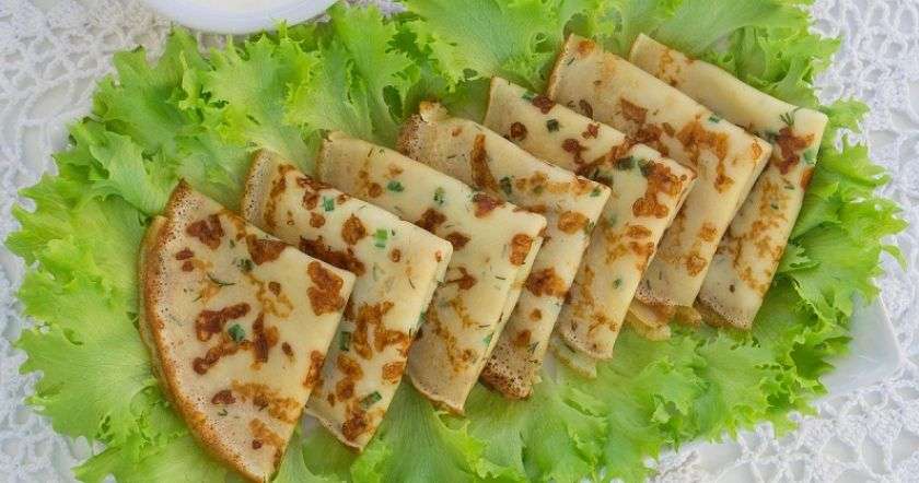 © DepositPhotos - Изумительные диетические блины с зеленью готовы! Всего 130 ккал на 100 г. Горячие блины аккуратно сверни конвертиками и скорее подавай к столу — уж очень они нежные и ароматные.