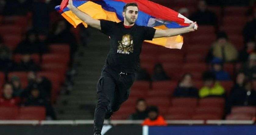 Во время матча на поле стадиона «Эмирейтс» выбежал болельщик в футболке с изображением национального героя Армении, участника карабахской войны Монте Мелконяна и флагом Арцаха.