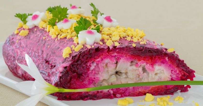 Обычная селедка под шубой может стать начинкой для французского багета и блинчиков, ее оформляют в виде бутербродной массы, аппетитных шариков или красивых цветов.