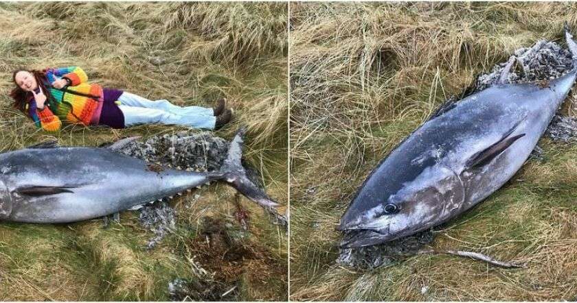 После сильных штормов на пляж острова Сандей в архипелаге Оркнейских островов выбросило огромного тунца длиной 2 метра. Хотя местные жители признали, что это было печальное зрелище, некоторые специалисты по рыбному промыслу увидели хороший знак и надеются, что данная рыба возвращается в этот район. Выглядит, конечно, впечатляюще.