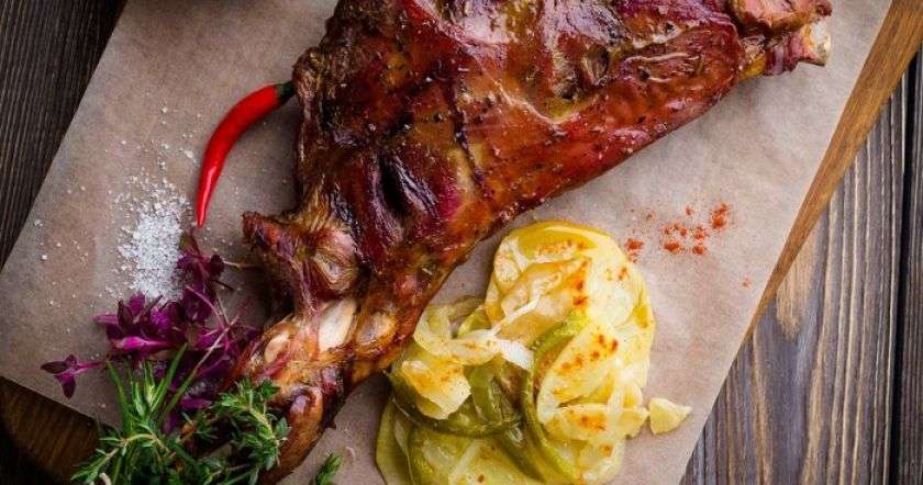 Предварительно замаринованную лопатку козленка завернуть в фольгу и запекать при температуре 100 градусов 4 часа. Затем извлечь из фольги, смазать ароматным маслом или утиным жиром и поставить в духовой шкаф на 10 минут при температуре 180 градусов.