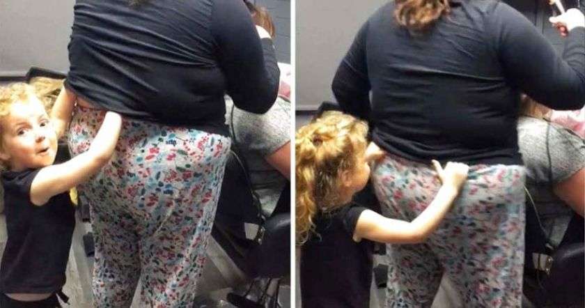 Когда Люси Каттс (Lucy Cutts) снимала сестру Эми (Amie), работавшую в своём салоне в Ноттингемшире (Англия), она даже не подозревала, что уже через мгновение вытворит её маленькая дочурка, почёсывающая спину тёти.