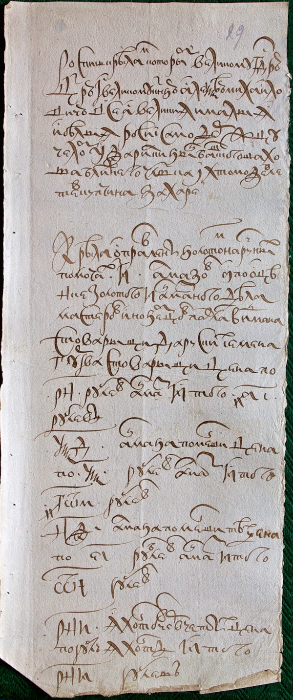 Кругом подушки 72 алмаза, цена по 5 рублев алмаз; итого 360 рублев. 39 яхонтов червчетых, цена ло 16 алтын по 4 ден. яхонт, итого 19 рублев 16 алтын 4 деньги.