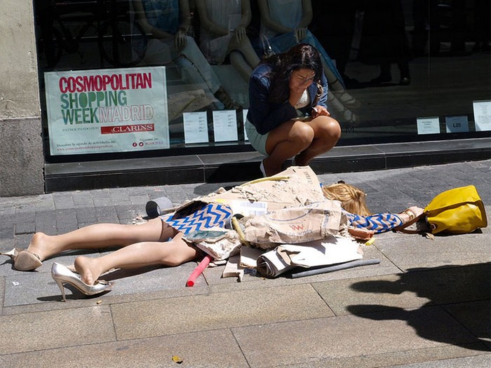 Испанская художница Иоланда Доминикес (Yolanda Dominguez) предлагает нам задуматься над тем, откуда берутся вещи, которые мы покупаем в магазинах, о той трагедии, которая, бывает, стоит за ними. Эти свои мысли она проиллюстрировала посредством перфоманса Fashion Victims (Жертвы Моды), устроенного на одной из торговых улиц Мадрида.