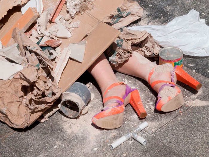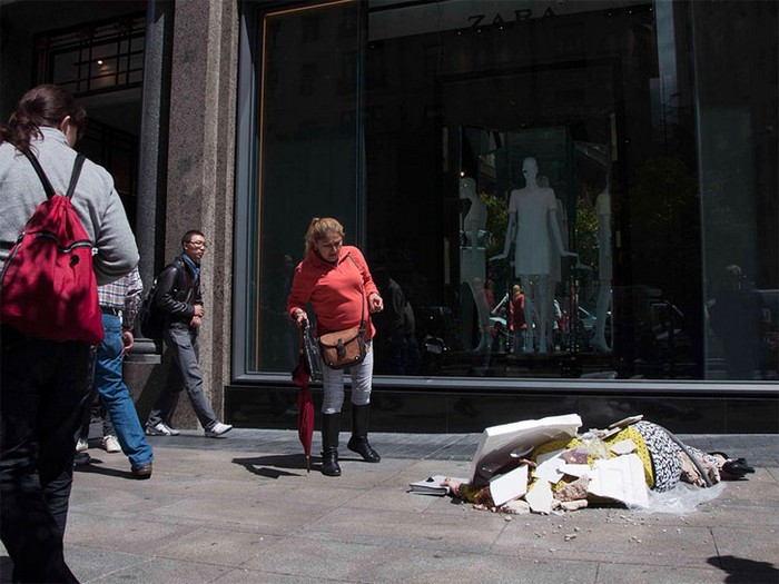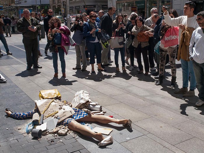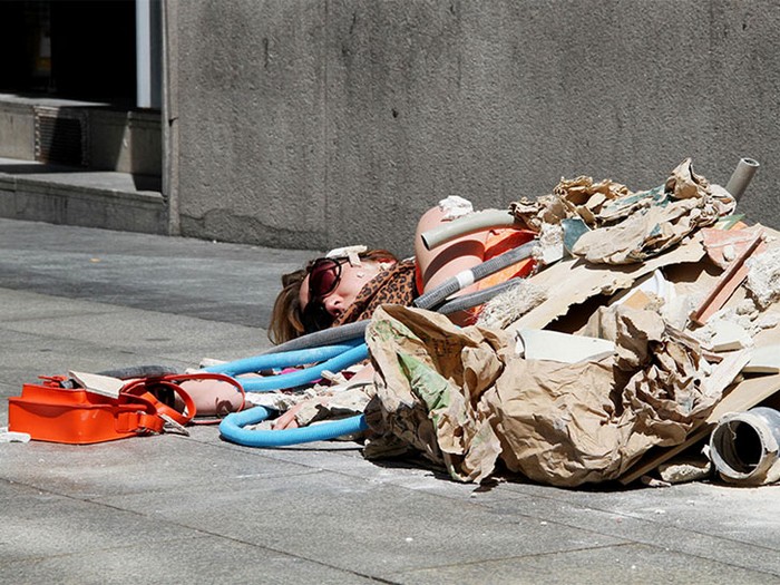 В рамках перфоманса Fashion Victims (Жертвы Моды) Иоланда Доминикес, одевшись в вещи из последних модных коллекций, легла на одной из торговых улиц в центре Мадрида, а помощники художницы завалили ее строительным мусором.