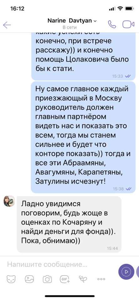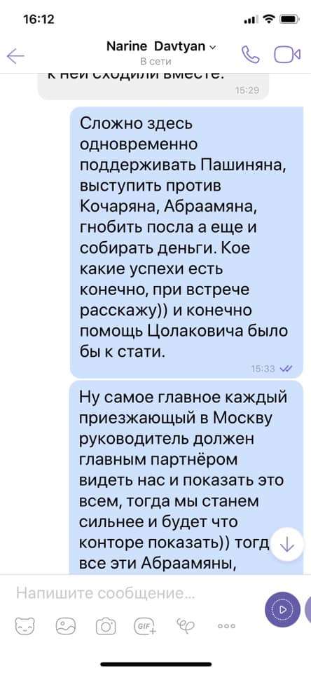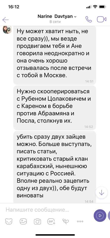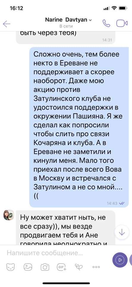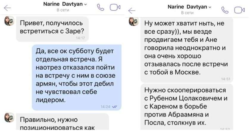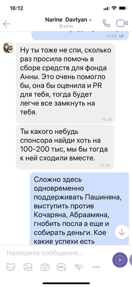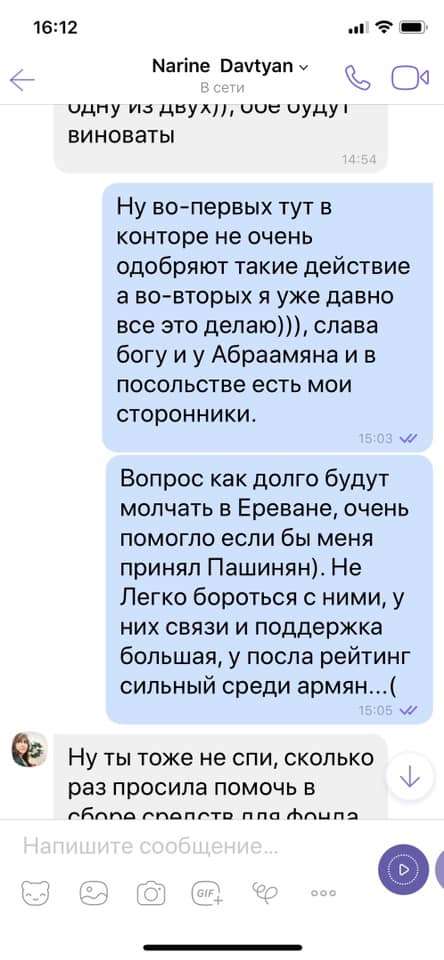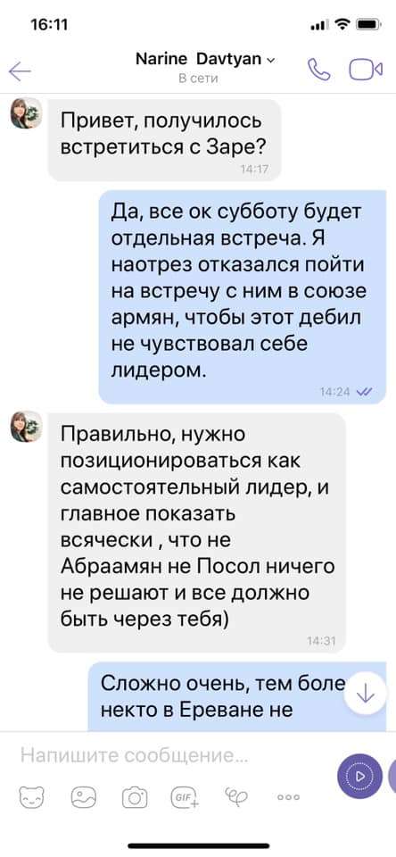 В сети появились скрин-шоты переписки Нарине Давтян с одним из армянских общественных деятелей .