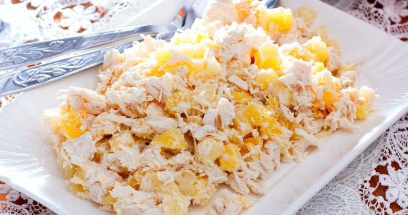 - Яйца и сыр натирай на крупной терке, добавляй туда кукурузу и ананас. Если ананас в формате колец, тогда его тоже нужно нарезать кубиками. Лучше всего, чтобы величина кусочков совпадала с кусочками куриной грудки.