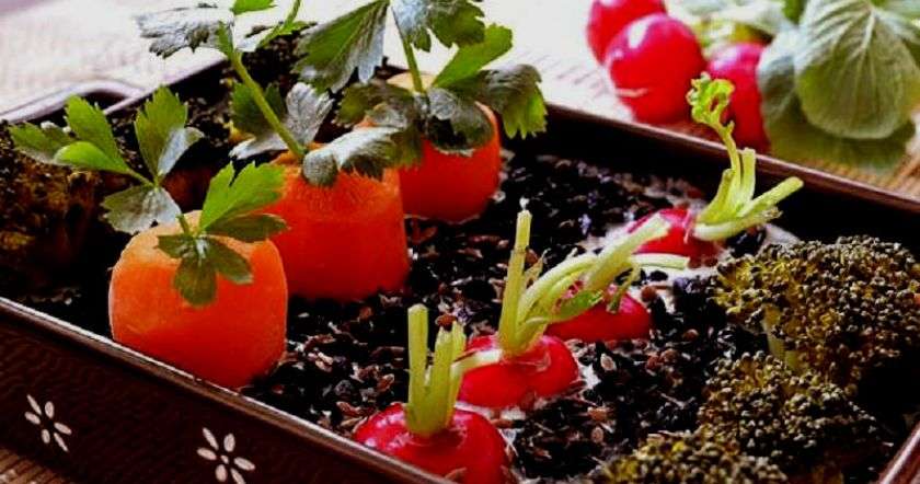 Подавать овощи можно в виде маленькой грядки. Минималистичная подача особенно ценится детьми, да и взрослые замрут от такой милой картины. Съедобная «земля» в кулинарии была «изобретена» Хестоном Блюменталем, одним из самых известных поваров современности.