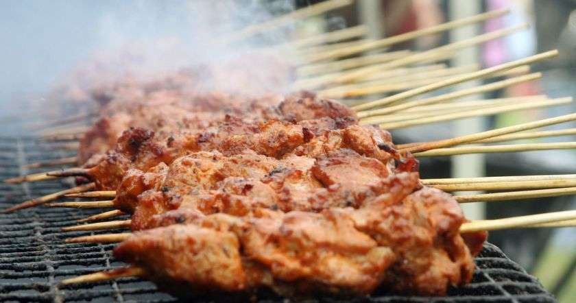 - Замаринованное мясо посолить по вкусу и дать постоять 15 минут, затем нанизать на деревянные шпажки по четыре кусочка мяса на каждую, чередуя с копченым салом.