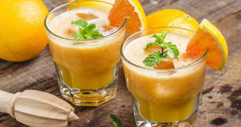 1. Апельсиновый сок + клубника + персики + ананасы + персиковый греческий йогурт (желательно без сахара):