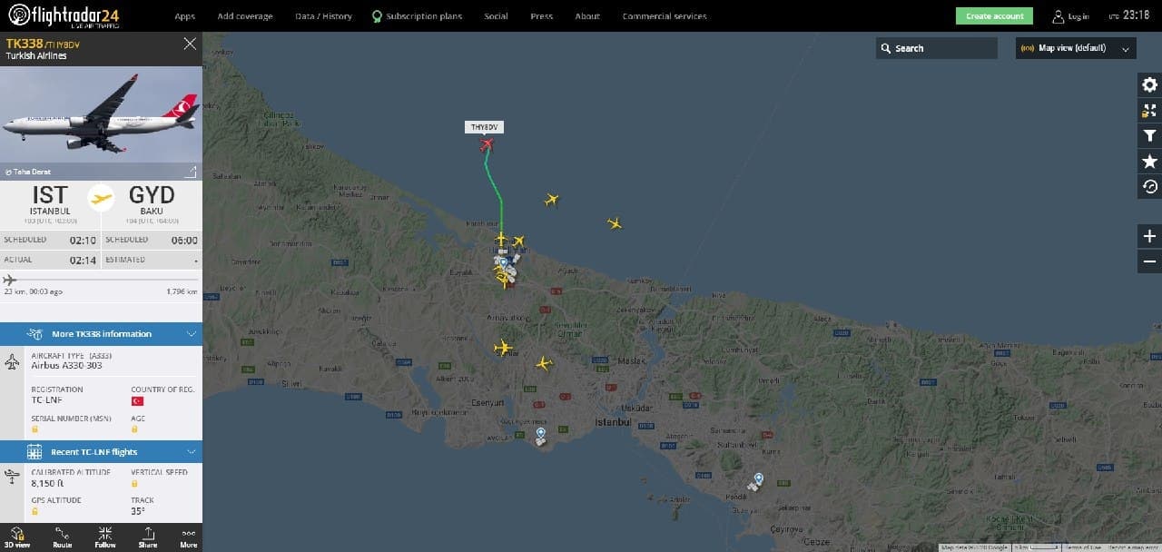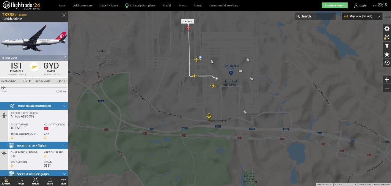 После этого рейса, около 03:10, из Стамбула в Баку отправился пассажирсктй самолет Airbus A330-303, принадлежащий компании Turkish Airlines TK338 / THY8DV.