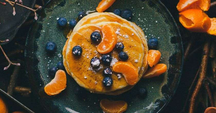 - Выкладываем «башенкой». Можно полить любимым сиропом или медом, а сверху украсить дольками мандарина и ягодами.