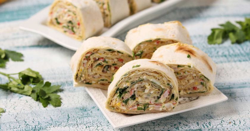- Свернуть лаваш в тугой рулет и разрезать на порционные ломтики. Подавать на блюде с зеленью или листьями салата.