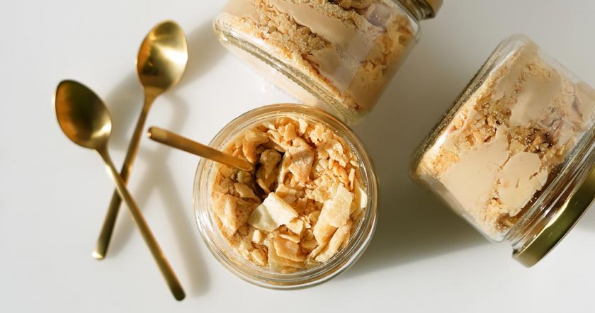 - Для сборки десерта выложите в порционные стаканчики или другие емкости по две столовые ложки песочной крошки, затем – по две столовые ложки заварного крема. Повторите слои, пока не соберете десерт полностью. Охладите в течение одного часа перед подачей.