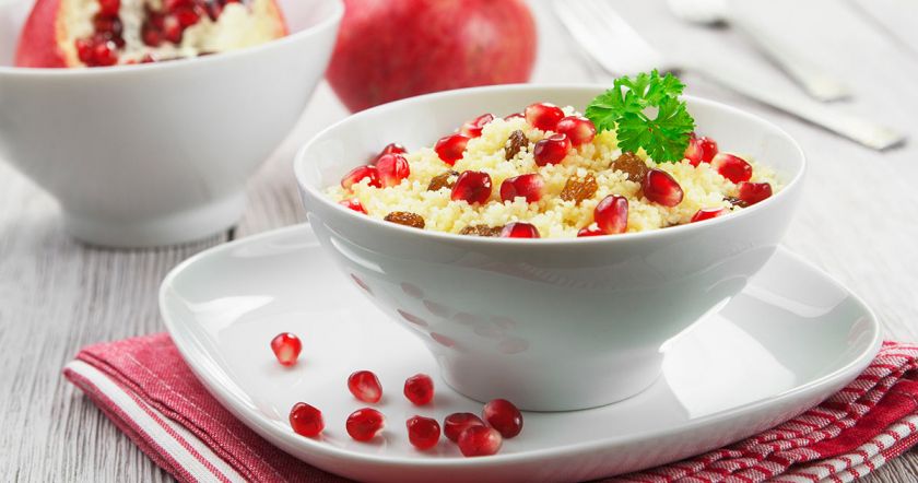 - Изюм промыть. Затем добавить в распаренный кускус. Хорошо перемешать. Сверху посыпать кашу зернами граната.