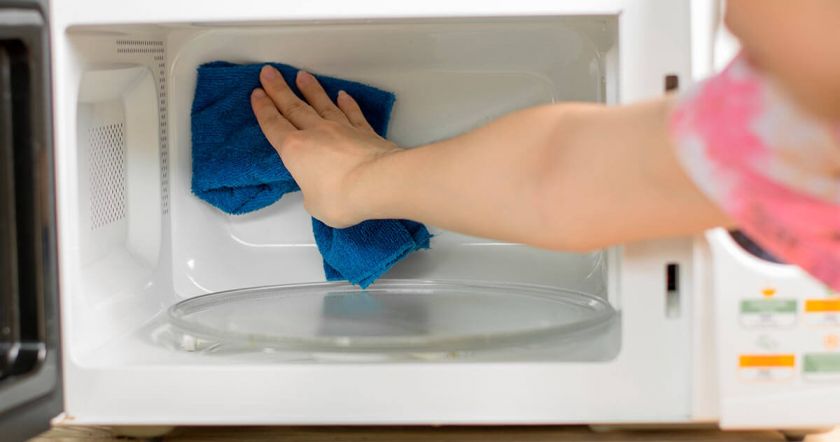 Еще один дешевый способ, который поможет легко и быстро отмыть микроволновку. Нужно намочить полотенце так, чтобы с него не стекала вода, и оставить разогреваться в печи в течение минуты или двух. В результате полотенце размягчит любые засохшие кусочки пищи. После того как оно остынет, нужно просто протереть им внутреннюю часть техники