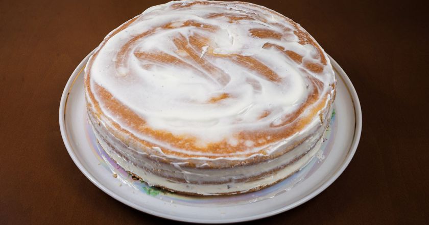 - Промажьте коржи кремом и выложите в виде торта. Обмажьте кремом и боковые части торта.