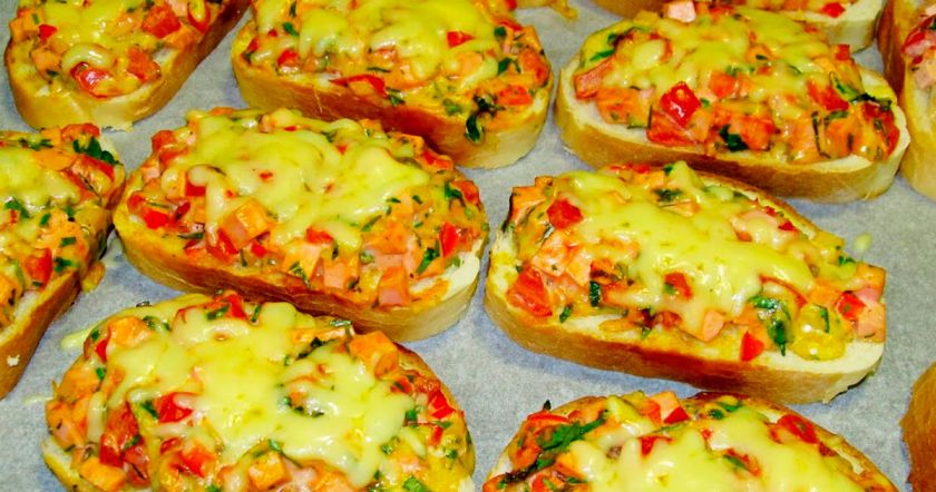 - Выложите начинку на хлеб. Запекайте бутерброды на противне в духовке, разогретой до 180 градусов, в течение 10–12 минут. Либо поставьте на 2-3 минуты в микроволновку – и горячие бутерброды будут готовы.