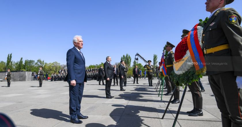 Премьер-министр Никол Пашинян прибыл в Цицернакаберд сопровождении спикера Алена Симоняна, президента Ваагна Хачатуряна, а также членов кабмина и депутатов парламента от фракции "Гражданский договор". Они возложили венки к мемориалу и цветы - к Вечному огню.