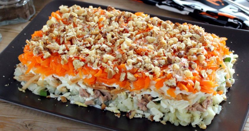 - Укройте тертой морковью и посыпьте рублеными грецкими орехами.