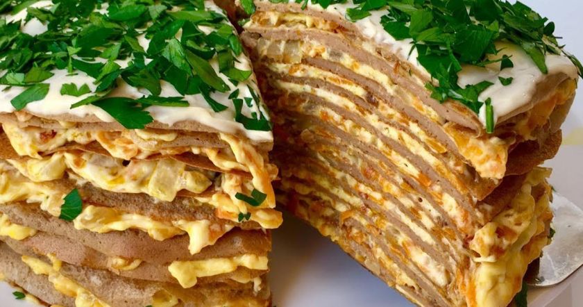 - Майонез смешать с чесноком и смазывать каждый блин, сооружая постепенно торт. Немного дать настояться в холодильнике.