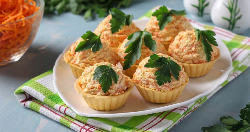 - Получившейся морковно-сырной массой наполните тарталетки, украсив закуску веточками укропа. По желанию тарталетки можно заменить на хлеб, намазав смесь сверху. Массу также можно просто выложить в креманки.