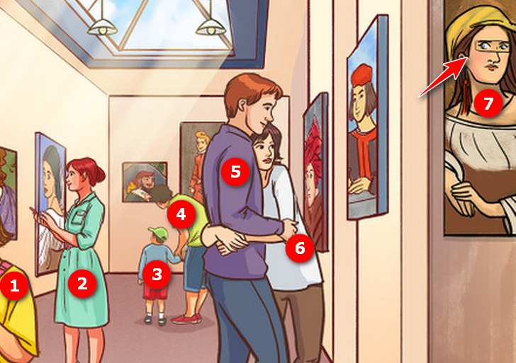 Картины и скульптура, конечно же, не идут в счет — это не люди. А за одним из полотен прячется наблюдатель.