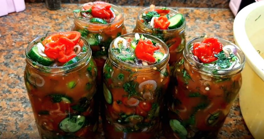 Летом помидоры и огурцы часто появляются в меню, однако зимой эти овощи дорожают. Тем, кто хочет сохранить урожай, а заодно разнообразить свой зимний рацион, пригодится рецепт овощного салата с огурцами и помидорами. Количество продуктов указано на четыре банки объемом 0,75 л.
