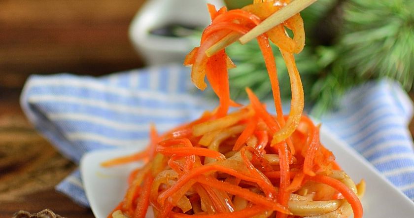 Хе из кальмаров – это вкусная и в меру острая закуска. Низкокалорийное блюдо готовится быстро и легко. Время маринования зависит от того, какую морковь вы хотите получить – хрустящую или мягкую.