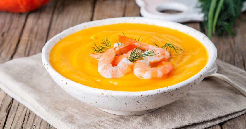 Суп по этому рецепту получается ярким на вид и сладким на вкус, а за нежную консистенцию отвечает кокосовое молоко. Его можно заменить нежирными сливками. Рыбный соус и креветки в супе отвечают за паназиатскую нотку и придают ему тонкий аромат.