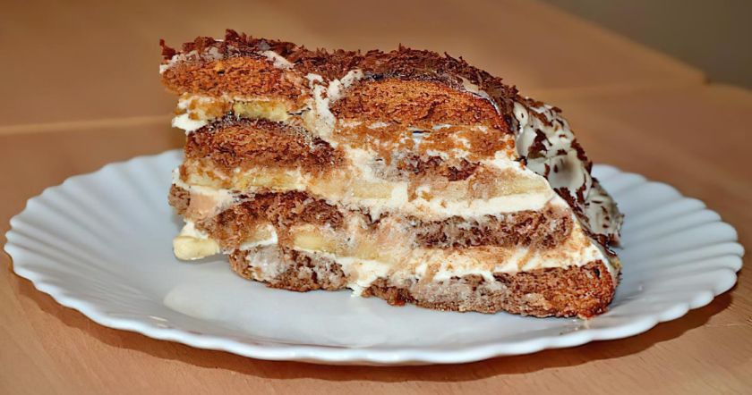 - На пряники кладем кружочки бананов. Повторяем эту схему, формируя торт в виде горки.