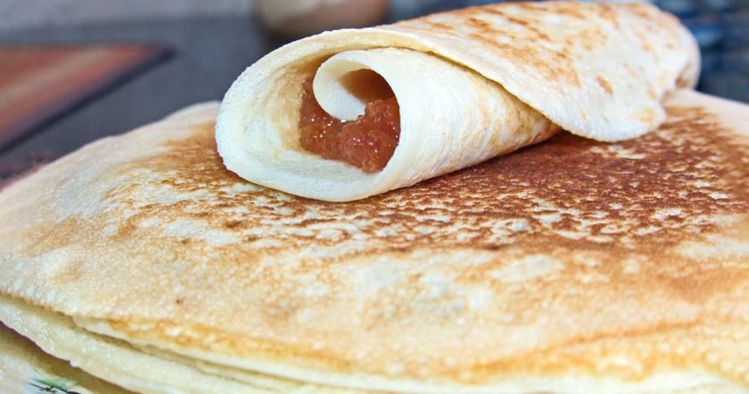 Заварные блины на кефире получаются мягкими и нежными. При этом не стоит их делать слишком большими: переворачивать в процессе выпекания будет немного сложно. Наиболее оптимальным диаметром каждого блина являются 18–20 см.