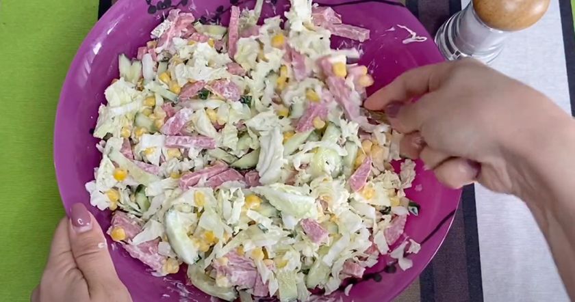 - Пекинскую капусту промойте, обсушите, мелко нашинкуйте. Добавьте к колбасе и огурцам.