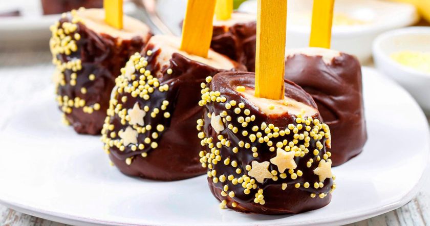 - Наколите кусочки бананов на деревянные палочки, например палочки от мороженого или прочные шпажки для канапе.