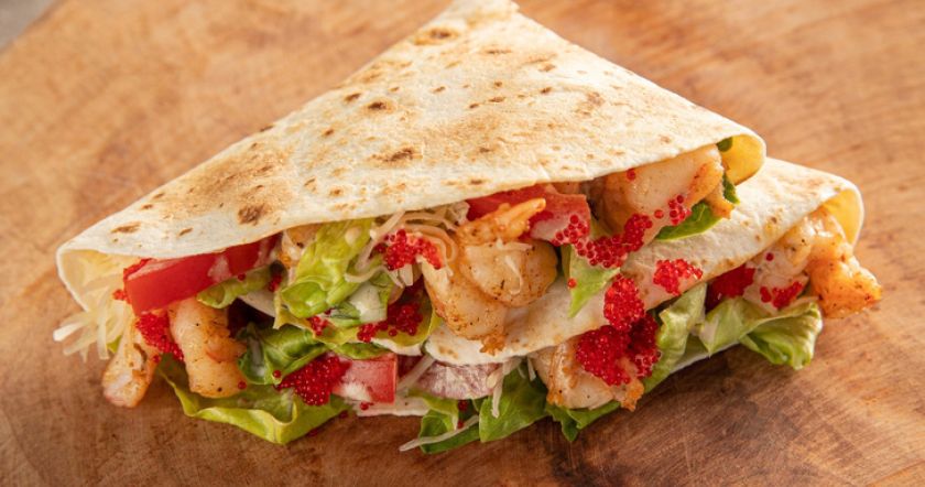 Помидор нарезать полукольцами, перец болгарский нарезать соломкой, соединить с салатом, листьями тархуна, соусом Цезарь, перемешать. Лепешку смазать сметаной с чесноком, выложить начинку на половину лепешки, сверху обжаренные креветки, сыр Пармезан, накрыть второй частью; обжарить с двух сторон до золотистой корочки. Выложить на посуду, украсить икрой тобико.