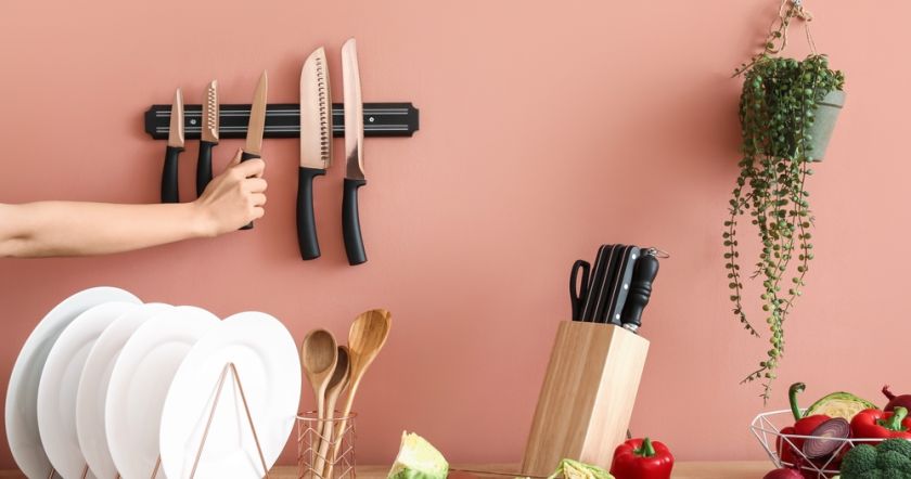 Пространство на столешнице — важная часть комфортного процесса готовки, оно должно быть максимально свободным. Один из способов убрать лишнее — повесить над столешницей магнитный держатель для ножей, кухонных ножниц и других столовых приборов.