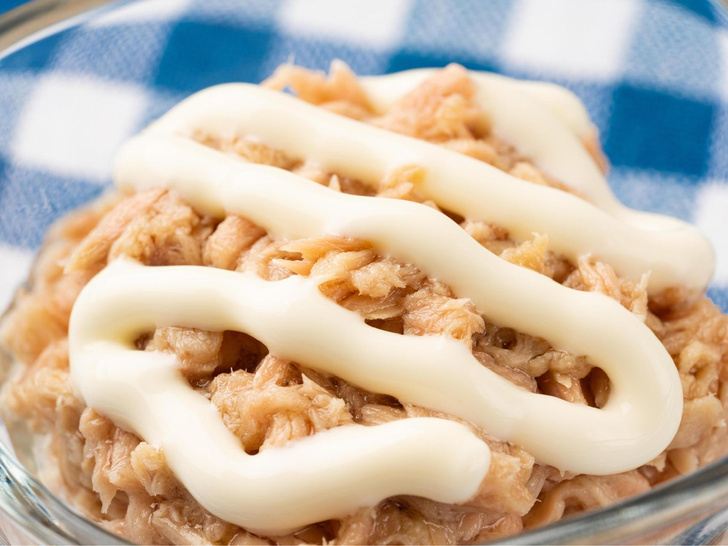 1) Выложите тунец на дно стеклянной формы для салата, сверху выложите майонез из мешка тонкими полосками.