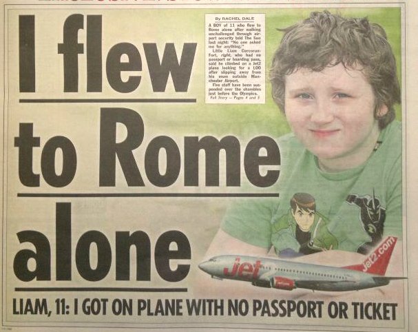 Маленький одиннадцатилетний Лиам Коркоран (Liam Corcoran) из Великобритании только что поссорился со своей мамой в супермаркете, и решил сбежать, чтобы не пришлось выслушивать родителя. Сначала он нашёл на полу проездной, при помощи которого он на автобусе добрался до ближайшего аэропорта. Затем, он начал искать туалет, и сам того не понимая прошёл несколько пунктов безопасности, после чего сел на самолёт, направлявшийся в Рим. Самолёт был уже в воздухе и достаточно далеко улетел, когда экипаж обнаружил безбилетника. После того, как самолёт развернулся и вернул его домой, у мальчика взяли интервью – который сказал, что пробраться на самолёт было даже легче, чем играть в компьютерные игры.
