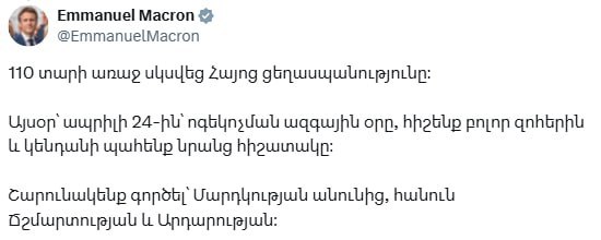 "110 лет назад начался Геноцид армян. Сегодня, 24 апреля, в Национальный день поминовения, вспомним всех жертв и сохраним живой их память. Продолжим действовать от имени Человечества, во имя Истины и Справедливости", - написал Макрон в X на армянском языке.