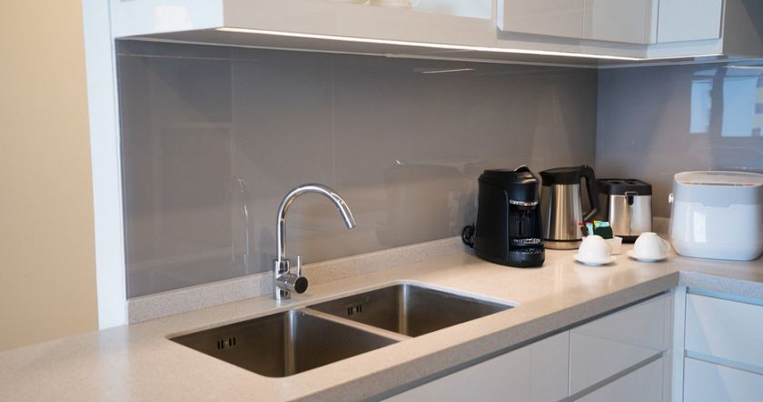 В отличие от нержавейки, искусственный камень поглощает звук воды, поэтому он бесшумный. Форму и цвет можно подобрать под интерьер. Он долговечный, сохраняет внешний вид даже спустя 10 лет. Отвечая на вопрос, из какого материала лучше выбрать мойку для кухни, отметим, что кварц один из самых прочных. Повреждения бывают только от неправильного ухода. Не любит перепады температуры, поэтому его нельзя резко нагревать и сразу же охлаждать. От очень горячей посуды могут остаться белые следы, а от чая или кофе — потемнение. При падении тяжелых предметов могут появиться трещины.