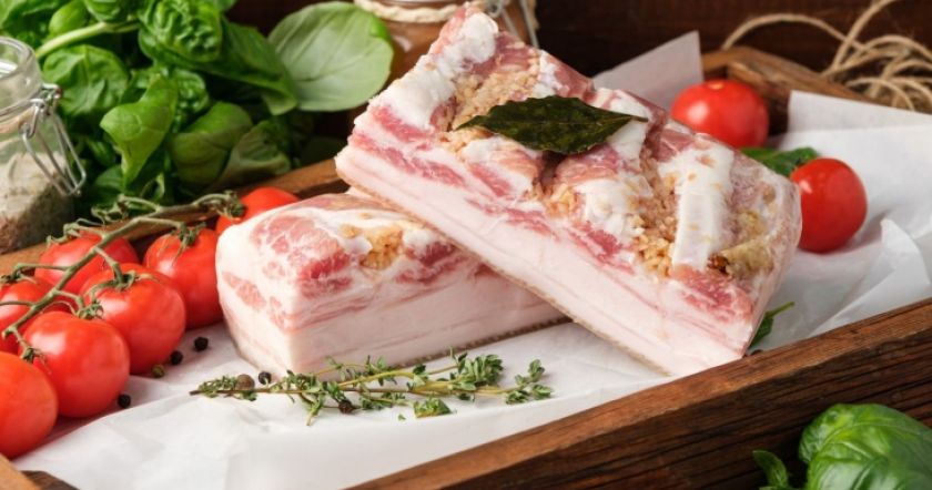 - Сало. Идеально подходит свиное сало с кожей, толщиной от 3 до 6 см. Лучшие участки — спинная часть (корейка, хребтовой срез).