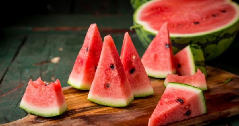 Арбуз. В небольшой тарелке — 11,5 г углеводов. Благодаря высокому содержанию воды он особенно полезен при обезвоживании на фоне гипогликемии.
