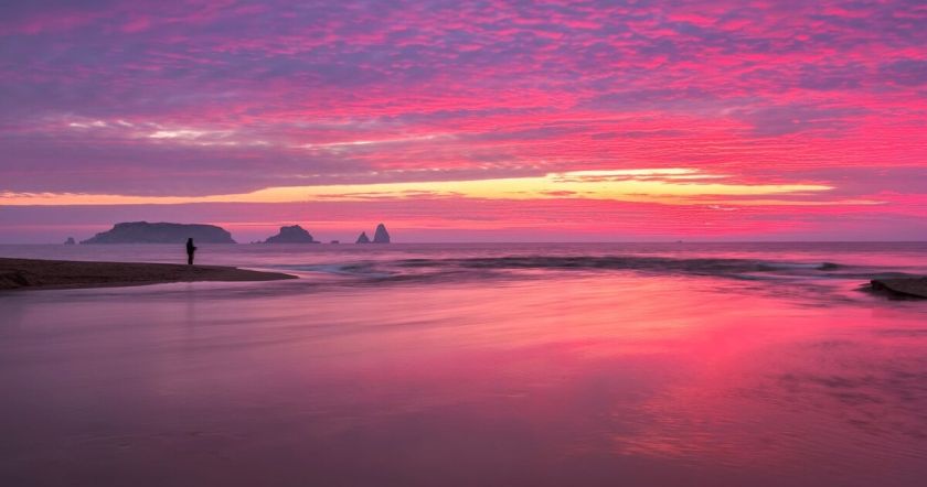 Иногда небо становится даже лиловым или пурпурным — это результат особого сочетания угла Солнца, влажности воздуха и количества частиц. Такие цвета появляются в условиях сильного загрязнения воздуха или после вулканических извержений, когда в атмосфере много аэрозолей. Также зависит от высоты облаков и положения наблюдателя.