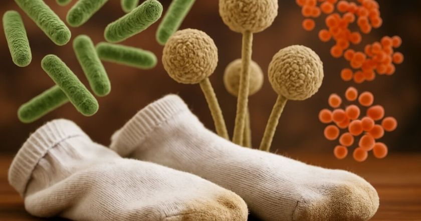 Грязные носки впитывают в себя всё: пот, отмершие клетки кожи, влагу — и, конечно же, микробов. Исследования показывают, что в носках находят как безвредные обитатели кожи (например, коагулазонегативные стафилококки), так и опасные патогены — Aspergillus, Candida, Histoplasma, Cryptococcus. Все это процветает между пальцами ног, а потом с легкостью перемещается в обувь, на полы и даже на постельное белье.