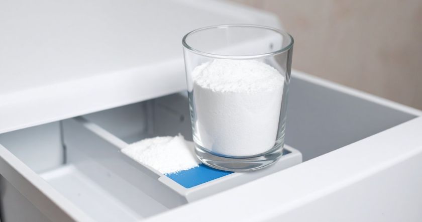 Во-вторых, ключевым элементом усиления отбеливающего эффекта становится обычная пищевая сода. Целый стакан двууглекислого натрия необходимо засыпать непосредственно в барабан стиральной машины перед загрузкой белья.