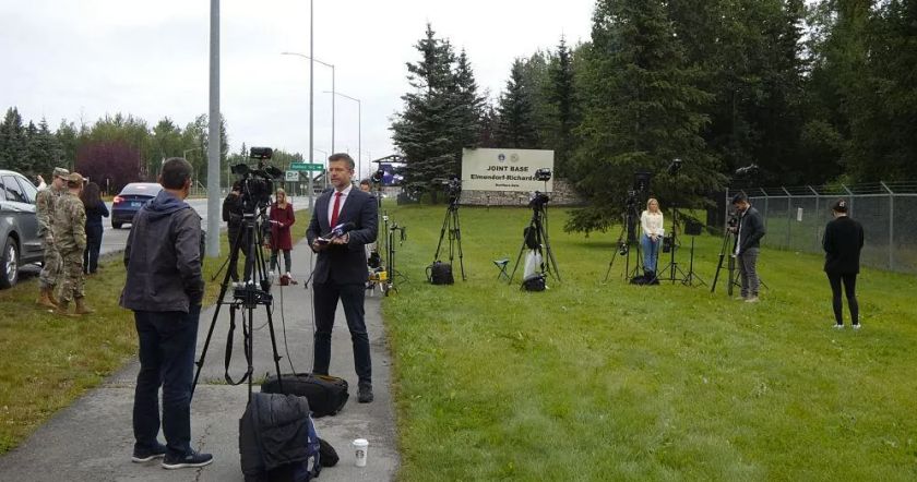 Представители прессы и военнослужащие перед входом на военную базу Элмендорф перед встречей Трампа и Путина