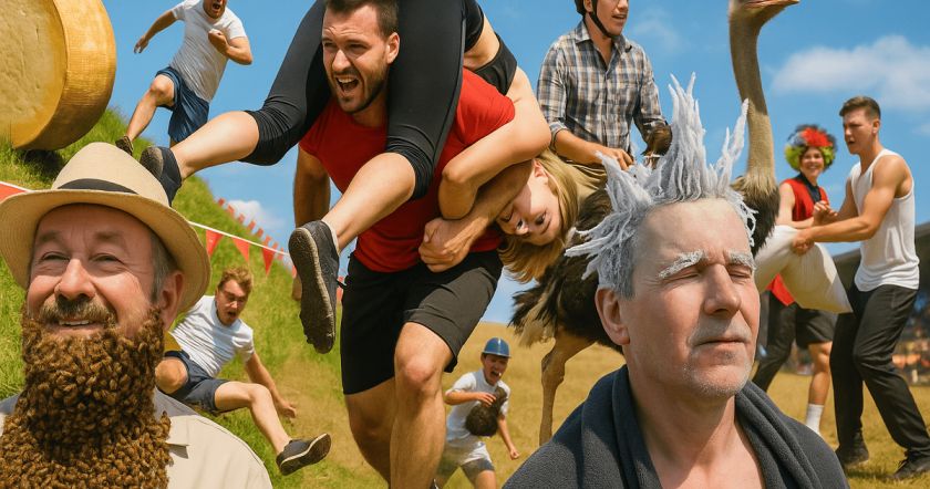 Каждую весну в графстве Глостершир десятки участников мчатся вниз по холму за головкой сыра «Дабл Глостер». Сыр весом около 4 кг разгоняется до 100 км/ч, а люди кувыркаются, падают и смеются до слёз. Победитель получает этот самый сыр и звание чемпиона. Фестиваль проводится уже более 200 лет и считается самым травмоопасным, но любимым соревнованием Британии.